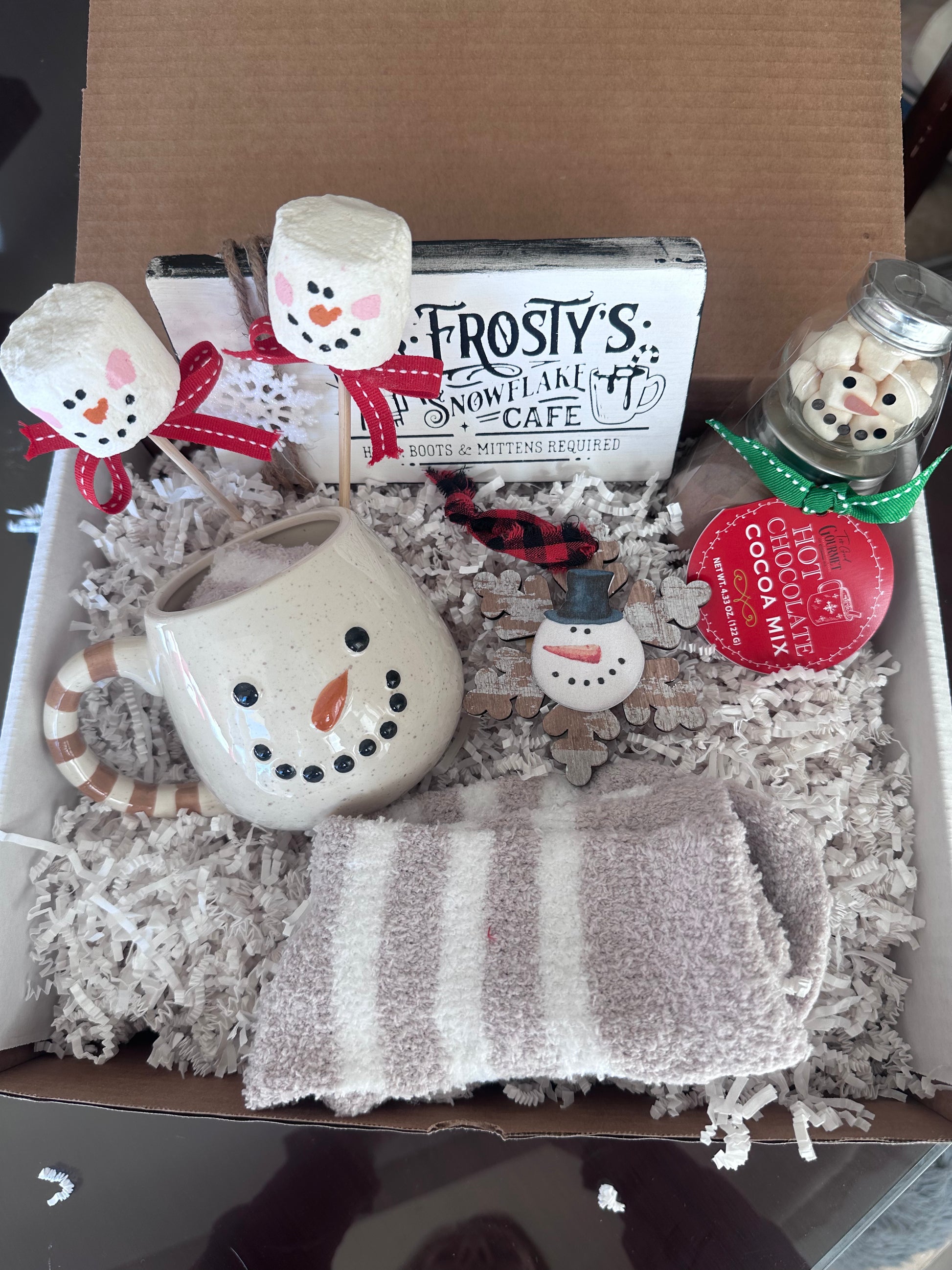 Frosty's gift box includes the snowman mug with fuzzy socks, the Frosty's Snowflake Cafe sign, Frosty's Hot Chocolate, 2 decorative marshmallows on a stick and a snowman on a snowflake ornament.